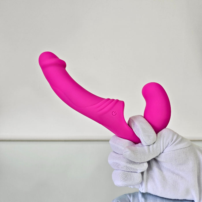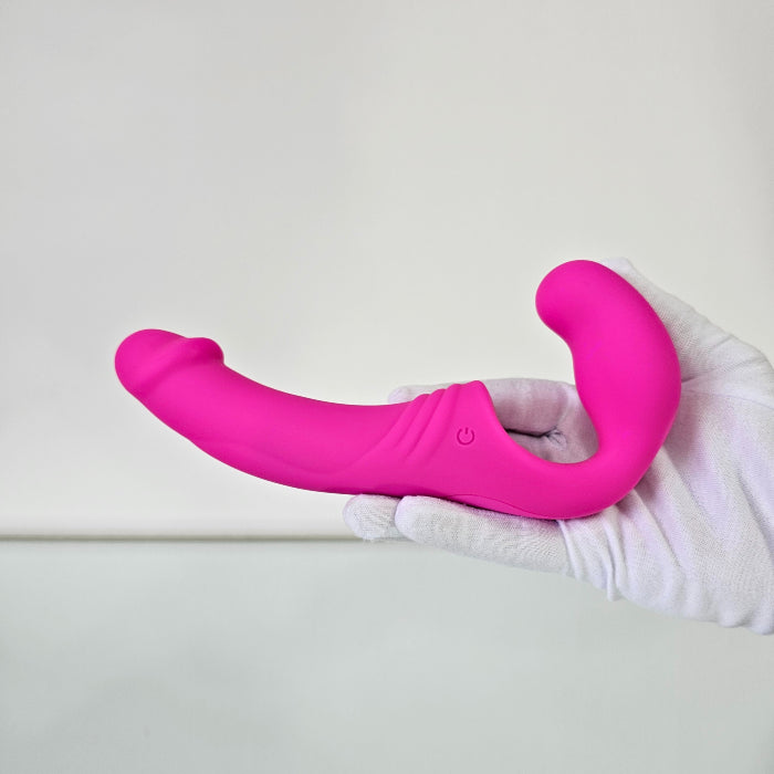 Hecho en silicona medicada, el cual es el material más suave y amigable con el cuerpo, este juguete tiene un diseño en el que su lado más corto cuenta con una curvatura y espacio que permite que, al ser penetrado en el canal vaginal, este se "abrace" y sostenga de la misma zona íntima femenina, haciendo la función de un strap-on sin correa o tirantes, por lo que quien lo lleva puesto sentirá todo el tiempo una intensa estimulación en punto G mientras penetra a su pareja, logrando una experiencia mucho más que satisfactoria.